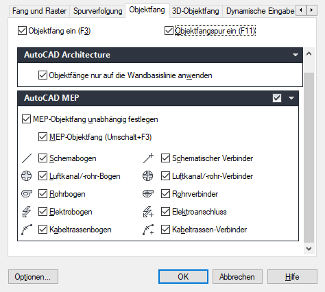 - Klicken Sie im Dialogfeld Entwurfseinstellungen auf die Registerkarte Objektfang, und blättern Sie bis zu AutoCAD MEP 2027-Toolset.