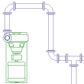 In den folgenden Abbildungen sehen Sie, wie Sie mithilfe von Positionsgriffen ein Pumpen-MV-Bauteil verschieben können. Die Rohre und Formstücke werden mitverschoben, aber alle anderen Komponenten der Strecke bleiben an ihrer ursprünglichen Position.
