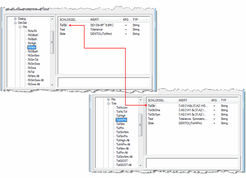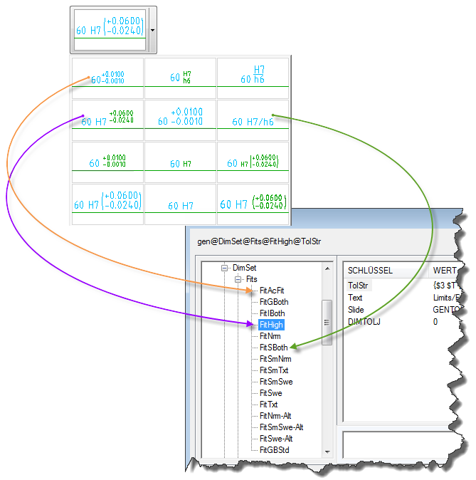 Die Schlüssel für die Einträge unter Fits und Tols sind gleich, unabhängig davon, ob sich ein Eintrag auf eine Passung oder eine Toleranz bezieht.