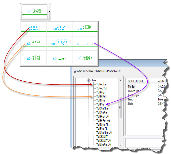 Tols entsprechen von oben nach unten den Toleranzdarstellungen in der Liste von links nach rechts.