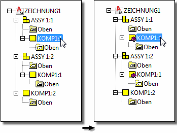 Die Referenzkomponenteneinstellung ist zuordnungsbasiert. Nur die betreffende Zuordnung wird als Referenzkomponente angesehen. Alle anderen Zuordnungen sind weiterhin normale Komponenten. Wenn die Zuordnung jedoch in einer anderen Baugruppe in derselben Zeichnung auftritt, wird sie als Referenzkomponente gekennzeichnet.