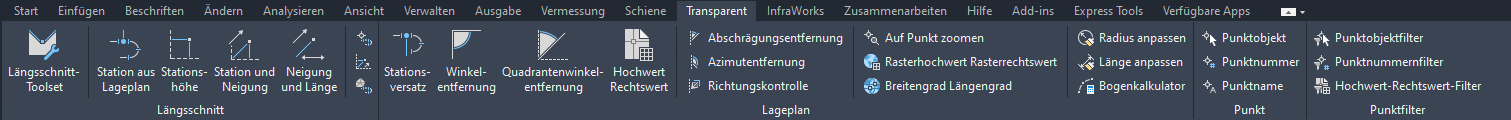 Sie können transparente Befehle über die Multifunktionsleisten-Registerkarte Transparent, aus dem Kontextmenü, über einen Werkzeugkasten oder durch Eingabe eines Befehls ausführen.