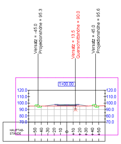 Sie können sowohl Projektionen als auch Querschnitte in Querprofilplänen anzeigen.