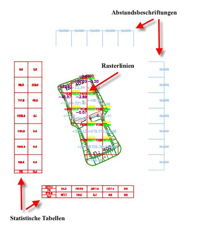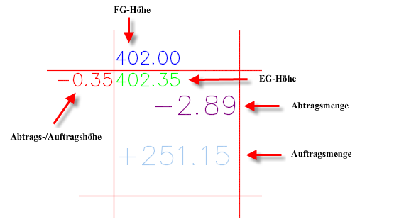 Mit dem Befehl Erdarbeitenplan-Erstellung können Sie Beschriftungen in ein Raster und Tabellen, die Informationen zur Menge der Erdarbeiten enthalten, zwischen zwei triangulierten DGMs einfügen. Die folgende Abbildung zeigt das Raster, die Beschriftungen und Tabellen, die mit diesem Befehl in eine Zeichnung eingefügt werden.
