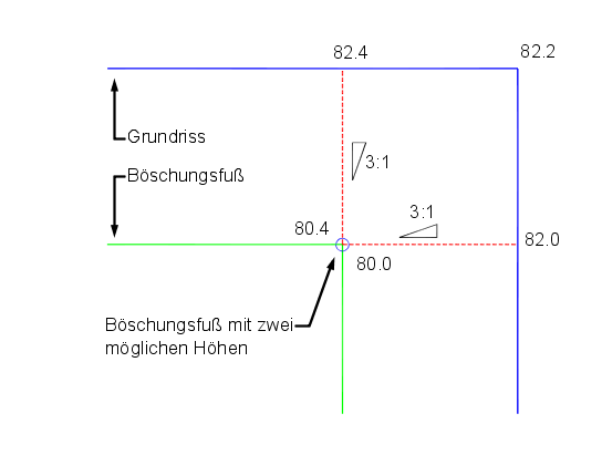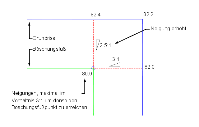 Auftrag: Erstellt eine Verschneidung, indem ein spezifischer Neigungswert auf ein Ziel nach unten projiziert wird. Neigungen (Verhältnis) können als Länge:Höhe bzw. Höhe:Länge oder als Prozentwert oder Dezimalzahl formatiert werden.