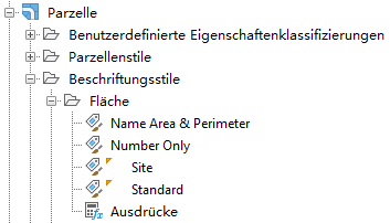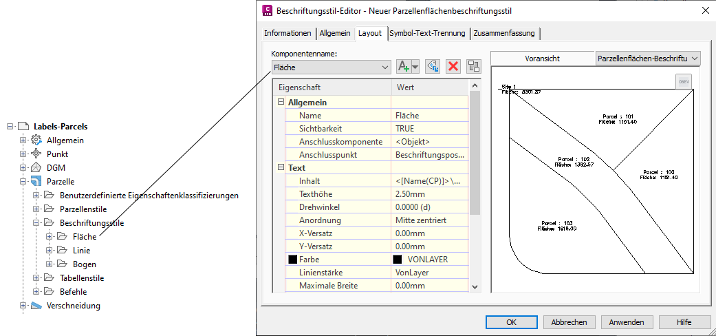 Parzellenflächenbeschriftungen werden in der Zeichnung genauso wie in der Voransicht des Beschriftungsstil-Editors angezeigt.