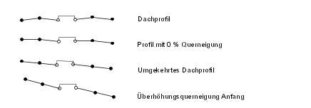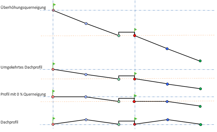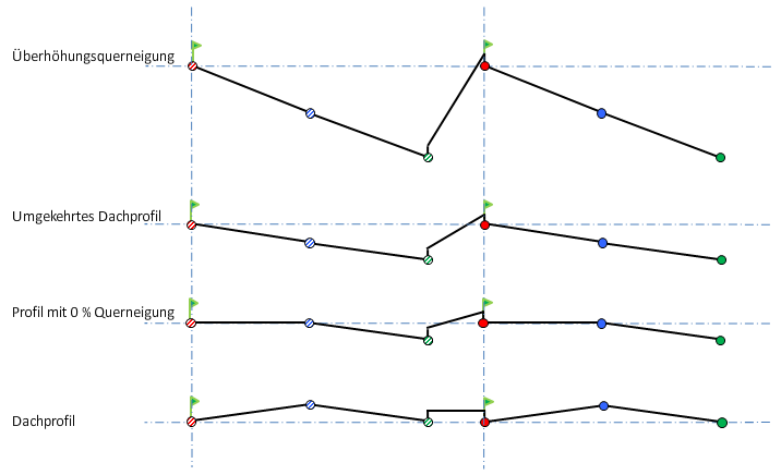 In der folgenden Abbildung ist eine baulich getrennte Straße als 3D-Profilkörpertyp und ein planares Querprofil dargestellt. Während der Querneigung durchläuft die Straße die Entfernung des gegenläufigen Dachprofils.