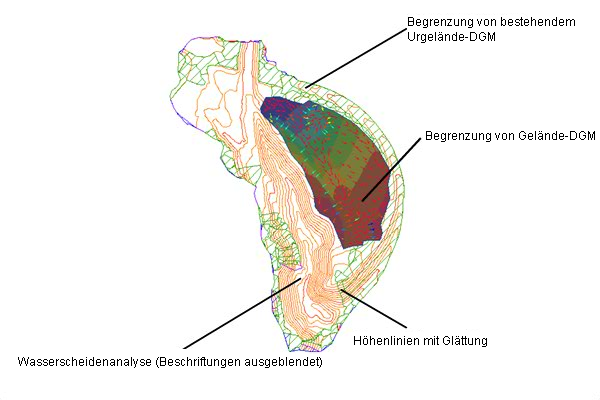 Punkte oder Höhenlinien sind normalerweise ein wesentlicher Teil der ursprünglichen DGM-Informationen und werden durch Bruchkanten und Begrenzungen ergänzt.