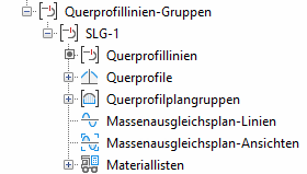 für den Zugriff auf Querprofillinien, Querprofile, Querprofilpläne, Massenausgleichsplan-Linien, Massenausgleichsplan-Ansichten und Materiallisten in einer Zeichnung.