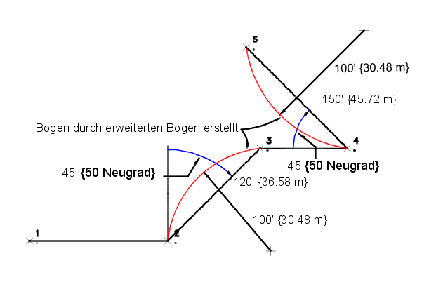| Radius | Der Abstand von einem Mittelpunkt zum Bogen Geben Sie diesen Wert in der aktuellen Abstandseinheit der Vermessungsdatenbank ein. Verwenden Sie einen negativen Radius, um den Bogen entgegen dem Uhrzeigersinn (nach links) zu zeichnen. |