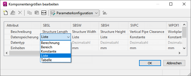 - Wenn Sie eine Liste der für die Komponente verfügbaren Werte hinzufügen möchten, müssen Sie den Datenspeicherungstyp von einem Größenparameter in Liste ändern.
