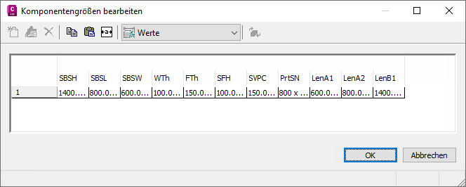 Tipp: Sie können Werte aus anderen Komponentenfamilien mit den normalen Microsoft® Windows-Funktionen ausschneiden und einfügen (STRG+C und STRG+V). Öffnen Sie eine weitere Komponente im Komponenten-Builder, wählen Sie den Größenparameter, den Sie kopieren möchten, und fügen Sie die ausgewählten Werte in den gewünschten Parameter der Komponente ein. Sie können auch in Microsoft® Excel eine Werteliste erstellen, die Werteliste auswählen, die Sie hinzufügen möchten, und anschließend die Werte in den gewünschten Parameter der Komponente einfügen.
