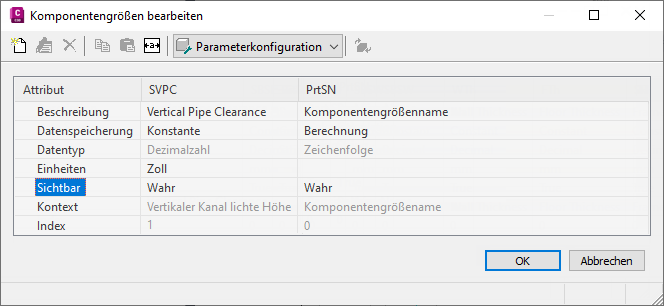Das Dialogfeld Komponentengrößen bearbeiten wird angezeigt, in dem alle derzeit verfügbaren Größenparameter für die ausgewählte Komponente aufgeführt sind. Im Fall des einfachen zylindrischen Schachts/Bauwerks lauten einige Größenparametervorgaben PrtSN (Komponentengrößenname) und SVPC (Vertikaler Kanal lichte Höhe).