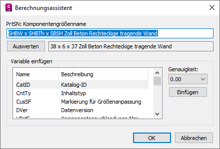 Außerdem können Sie eindeutige Namen für Komponentengrößen erstellen. Jeder Komponentengrößenname wird mithilfe einer Berechnung generiert, d. h. es handelt sich um eine formatierte Zeichenfolge aus Parameterwerten und Text.
