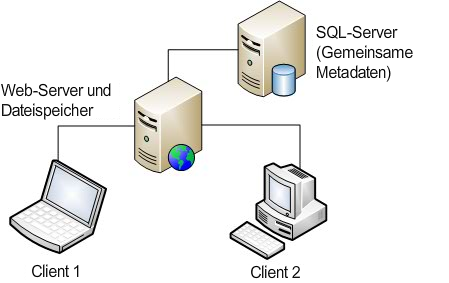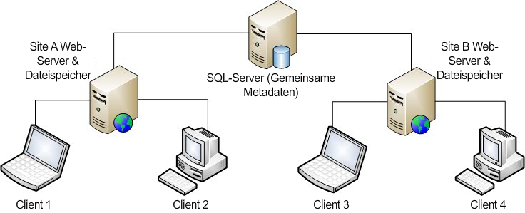 Die optionale Multi-Site-Funktion von Vault unterstützt die gemeinsame Verwendung von Tresoren durch Arbeitsgruppen an unterschiedlichen Standorten. Eine einzelne Instanz von Remote SQL verwaltet mehrere Server, die jeweils über einen eigenen Dateispeicher in unterschiedlichen Büros verfügen. Abhängig von ihrer Berechtigungsebene können alle Benutzer an allen Standorten alle Dateien anzeigen, so als wäre das System eine einzige Datenbank.
