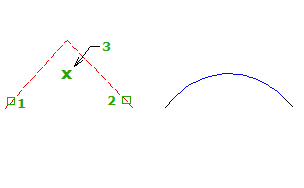 Wählen Sie nach Auswahl der beiden Linien (1-2) den Zwangspunkt (3) aus. Die Linienobjekte werden auf den Kurvenpunkt (PC) und den Tangentenpunkt (PT) gestutzt.
