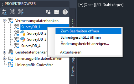 - Erweitern Sie im Projektbrowser auf der Registerkarte Vermessung die Sammlung Vermessungsdatenbanken.