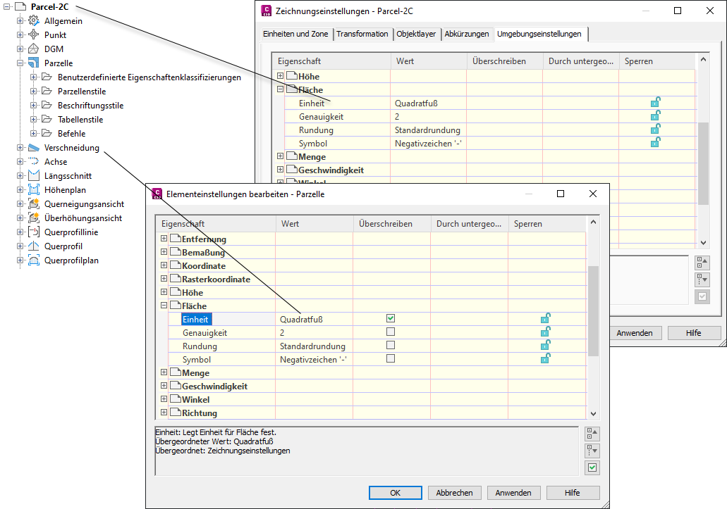 Das Häkchen in der Spalte Überschreiben des Dialogfelds Elementeinstellungen bearbeiten - Parzelle (unteres Dialogfeld) zeigt an, dass der in diesem Dialogfeld eingestellte Wert die Einstellung auf einer höheren Ebene überschreibt.