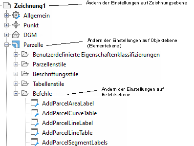 Auf der Ebene der Befehlssammlung in der Struktur Einstellungen können Sie sowohl die Einstellungen auf Objektebene als auch die Zeichnungs-Umgebungseinstellungen überschreiben. Sie können auch befehlsspezifische Einstellungen festlegen.
