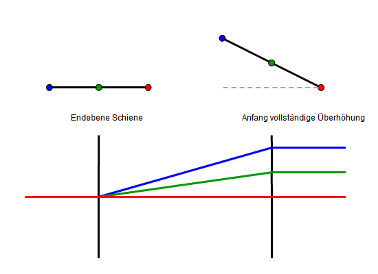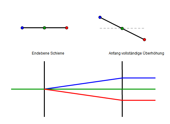 In der folgenden Abbildung wird die Drehpunktmethode Hochrand - Schiene für einen eingleisigen Schienenweg gezeigt.