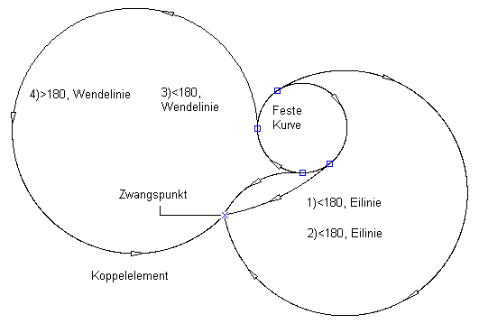 Hieraus resultiert ein Koppelelement (Bogen), das immer Tangente zu dem Objekt ist, dem es zugeordnet ist.