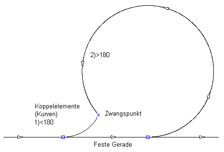 Die folgende Abbildung zeigt einen Bogen als Koppelelement, der einem Geraden-Festelement zugeordnet ist, sowie zwei mögliche Lösungen für einen vorgegebenen Radius und Punkt: