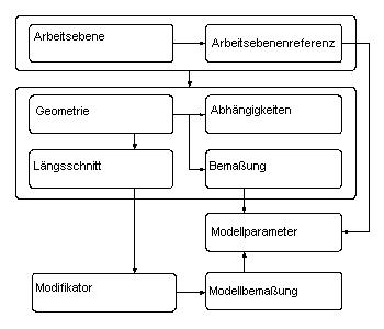 Die folgende Abbildung zeigt die Elemente, aus denen sich das Modell zusammensetzt. Die Richtung der Beziehungen zwischen den Elementen wird durch Pfeile symbolisiert. Das Ändern einer Geometrie hat beispielsweise Auswirkungen auf einen Längsschnitt, dieser auf einen Modifikator usw. Nehmen Sie dabei regelmäßig diese Abbildung zu Hilfe, um sich die Beziehungen zwischen den Elementen vor Augen zu führen.