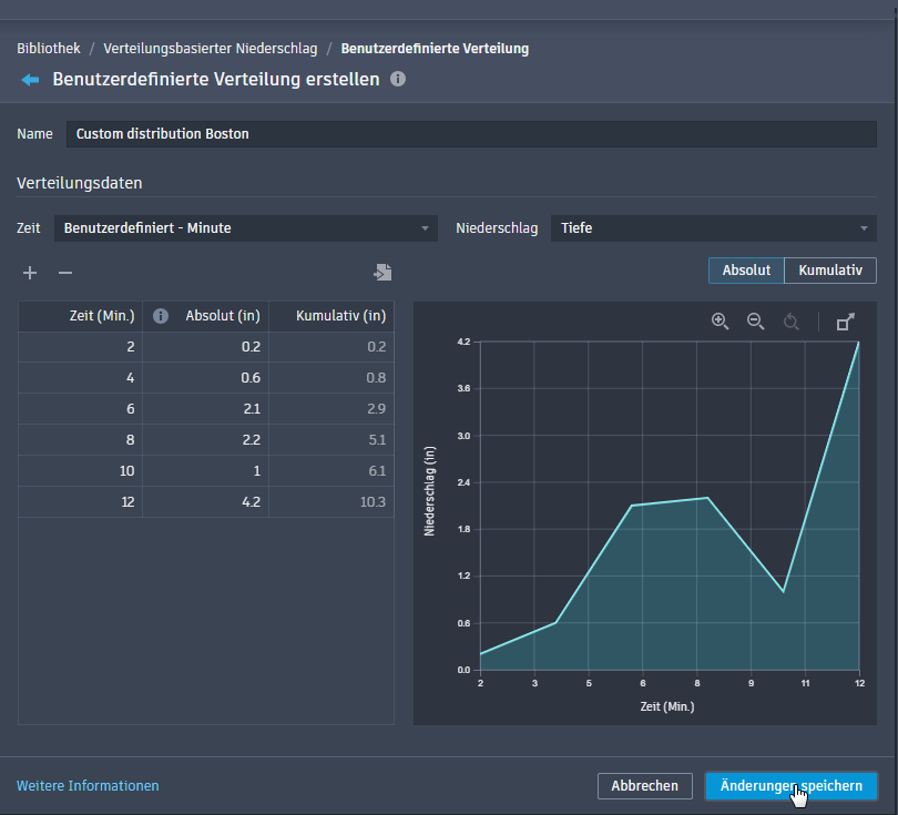 Durch die Erstellung einer benutzerdefinierten Verteilung wird die Niederschlagsverteilung (Temporalmuster) für verteilungsbasierte Niederschlagsereignisse definiert.
