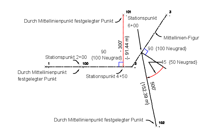 Punkt 100 befindet sich an Station 200 mit einem Versatz von Null. Punkt 101 befindet sich an Station 450 mit einem linken Versatzabstand von 91.44. Punkt 102 befindet sich an Station 600 mit einem rechten Versatzabstand von 152.4 und einem schiefen Winkel von 50.