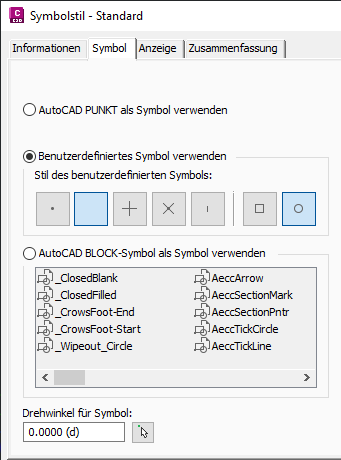 Symbolstile können so konfiguriert werden, dass sie AutoCAD-Punkte, benutzerdefinierte Symbole oder Blöcke verwenden.