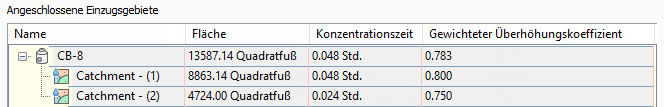Zeigt die Konzentrationszeit jedes Einzugsgebiets und die längste Konzentrationszeit für alle angeschlossenen Einzugsgebiete an.