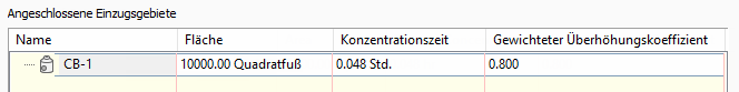 Wenn keine Einzugsgebiete an den Schacht/das Bauwerk angeschlossen sind, können Sie Einzugsgebietswerte direkt in die Felder Fläche, Konzentrationszeit und Gewichteter Überhöhungskoeffizient eingeben.