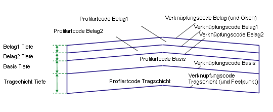 Die Standard-Verknüpfungscodes sind (von oben nach unten) Belag, Belag1, Belag2, Basis und Tragschicht. Der Code Oben wird auch allen Deckschichtverknüpfungen zugewiesen und stimmt daher mit den Verknüpfungen vom Typ Belag auf befestigten Querprofilen überein. Der Code Planum wird auch dem Grund der Tragschicht zugewiesen. Die Profilart-Codes für die Materialflächen sind (von oben nach unten) Belag1, Belag2, Basis und Tragschicht.