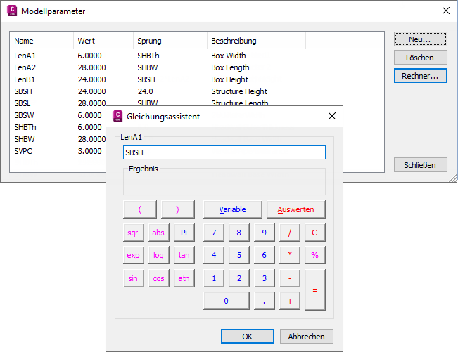 - Wenn Sie in der Spalte Gleichung auf den Wert für einen Modellparameter klicken (z. B. LenB1), können Sie einen Wert oder eine Gleichung eingeben, um die Länge der Komponente anzugeben.