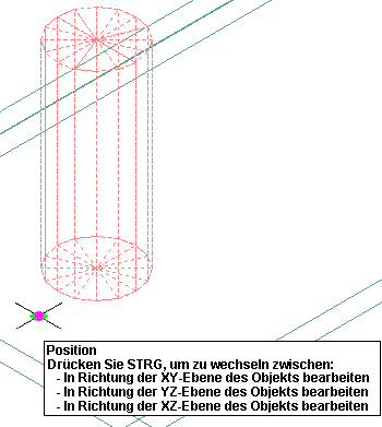 Positionieren Sie einen vorhandenen MV-Block neu, indem Sie die Koordinaten des zugehörigen Einfügepunkts ändern. In der Modellansicht stehen für den Positionsgriff drei Änderungsmöglichkeiten zur Verfügung: Entlang der XY-Ebene bearbeiten, Entlang der XZ-Ebene bearbeiten und Entlang der ZX-Ebene bearbeiten. Drücken Sie die STRG-Taste, um die Modi nacheinander durchzugehen und zum gewünschten Modus zu gelangen. Die Vorgabe ist der Modus Entlang der XY-Ebene bearbeiten. In der Draufsicht ist die Bewegung des Positionsgriffs auf eine Ebene beschränkt.