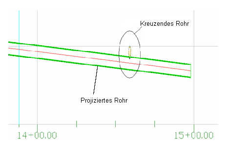 Haltungen, die einen Höhenplan schneiden, können als projiziert bzw. als Haltungsüberschneidungen angezeigt werden. Haltungen, die einen Querprofilplan schneiden, werden stets als Haltungsüberschneidungen angezeigt.