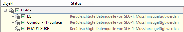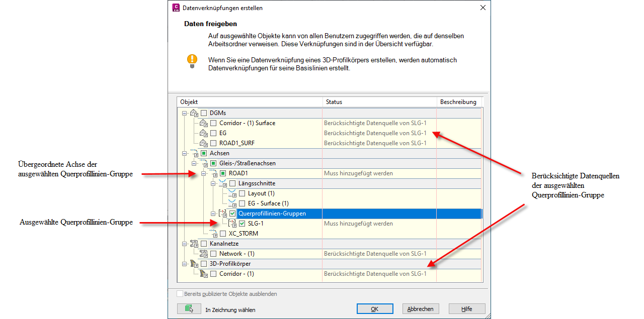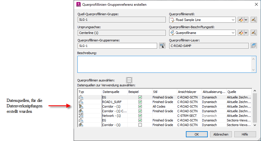 Durch Erstellen der Datenverknüpfungen für diese berücksichtigten Datenquellen können Sie auch automatisch Datenverknüpfungsreferenzen auf die berücksichtigten Datenquellen erstellen, wenn Sie die Referenz auf die Querprofillinien-Gruppe generieren.