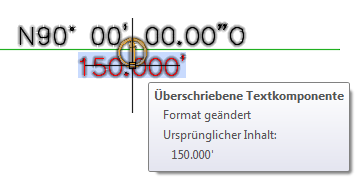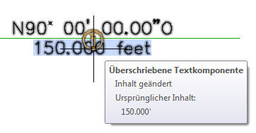 Inhalt geändert: Gibt an, dass entweder der Inhalt oder der Inhalt und das Format der Beschriftung geändert wurden. In der folgenden Abbildung wurde das Fuß-Symbol (') geändert.