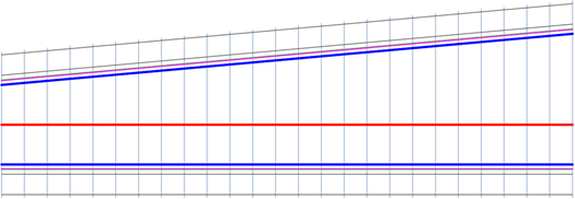 Wenn Sie eine Zeile in der Panorama-Ansicht auswählen, wird der entsprechende Übergang in der Zeichnung durch blaue Symbole hervorgehoben.