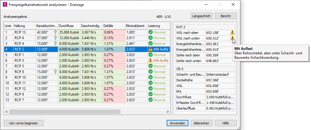 Wenn Sie auf die Schaltfläche Analysieren im Dialogfeld Freispiegelkanalnetzwerk analysieren klicken, wird die Seite Ergebnisse angezeigt.