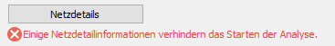 Wenn der von Ihnen ausgewählte Analysetyp nicht möglich ist, wird unter der Schaltfläche Netzdetails auf der Seite Allgemein des Dialogfelds Freispiegelkanalnetzwerk analysieren eine Fehlermeldung angezeigt.