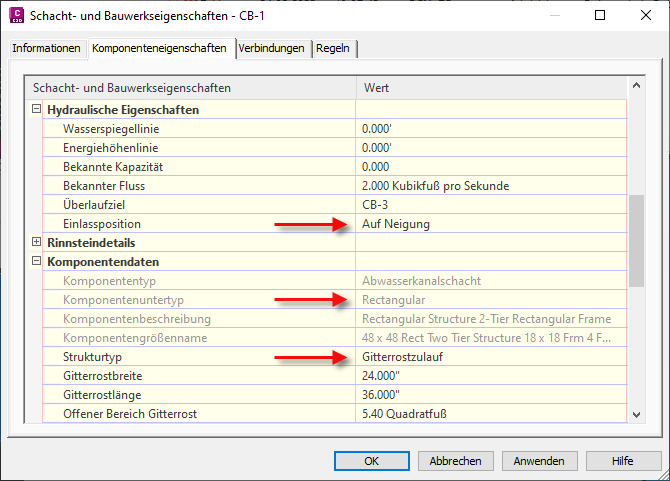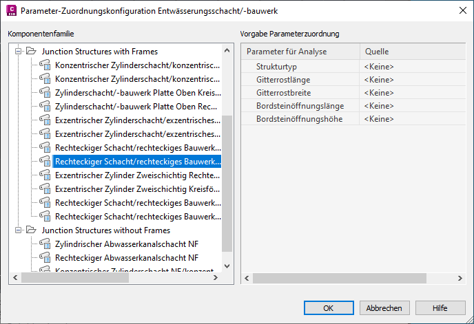 Sie können die Parameter von Komponenten, die mit dem Komponenten-Builder erstellt wurden, den Parametern zuordnen, die für den Befehl Freispiegelkanalnetzwerk analysieren erforderlich sind.