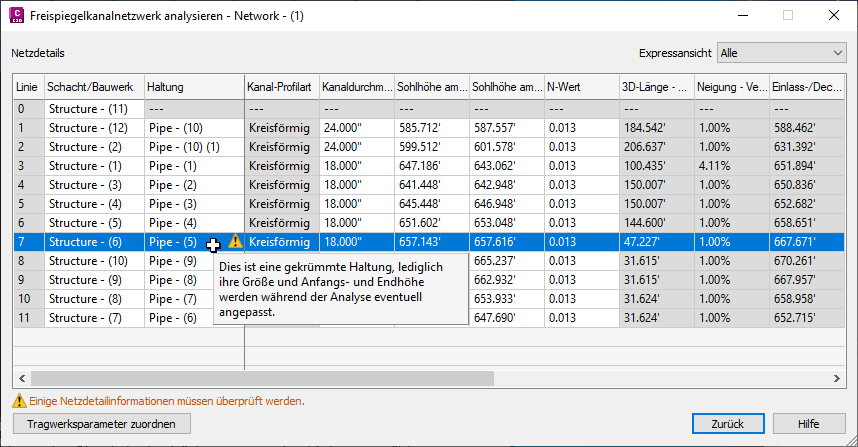 Weitere Informationen finden Sie auf der Seite Netzdetails (Dialogfeld Freispiegelkanalnetzwerk analysieren).