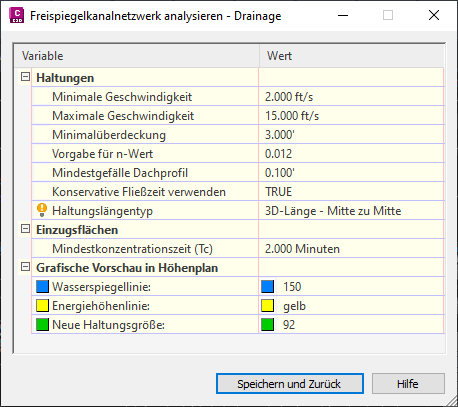Mithilfe des Befehls Freispiegelkanalnetzwerk analysieren können Sie Haltungen neu dimensionieren, Sohlen zurücksetzen und Energiehöhenlinien und Wasserspiegellinien gemäß den Vorgaben von HEC-22 berechnen.
