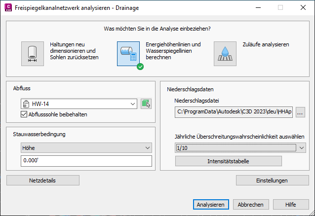 Es stehen drei Analysetypen zur Auswahl: Haltungen neu dimensionieren und Sohlen zurücksetzen, Energiehöhenlinien und Wasserspiegellinien berechnen und Zulaufanalyse.