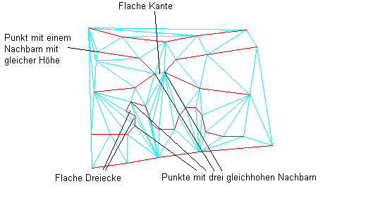 Die Bedingung "Mehrere Höhenlinien" tritt auf, wenn ein Punkt über mehr als zwei benachbarte Punkte auf derselben Höhe verfügt. Sie tritt in der Regel in einem flachen Bereich des DGM auf. Wenn diese Bedingung erkannt wird, können Sie das Problem mit dem Vorgang Flache Flächen minimieren korrigieren. Wenn sich der Punkt auf dem Rand des DGM befindet, können die flachen Flächen einfach eine unbeabsichtigte Erscheinung der Triangulation sein. Sie können diese unbeabsichtigten Dreiecke entfernen. Verwenden Sie hierzu den Vorgang Linie löschen, oder fügen Sie eine verborgene Umgrenzung ein.