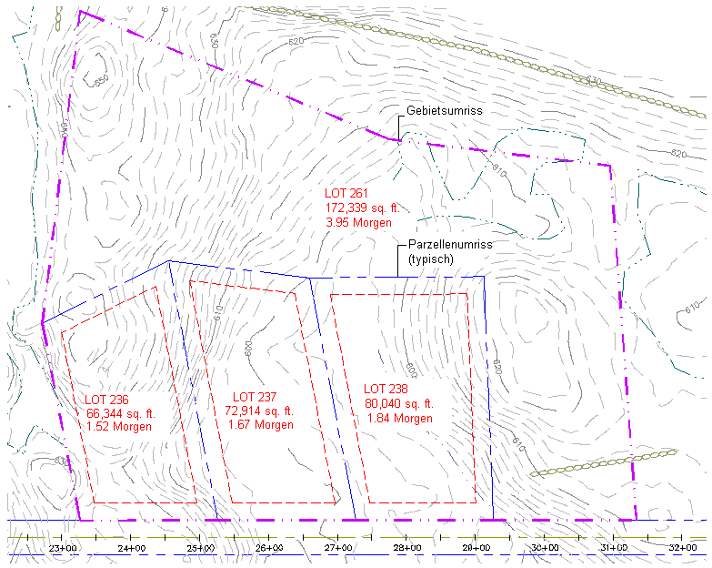 Die Gebietsparzelle verfügt über eine Flächenbeschriftung, die verdeckt oder angezeigt werden kann. Sie können die Farbe und den Linientyp der Gebietsparzellenumgrenzung steuern sowie deren Zeichnungsreihenfolge in Relation zu den Grenzen der von ihr eingeschlossenen Parzellen.