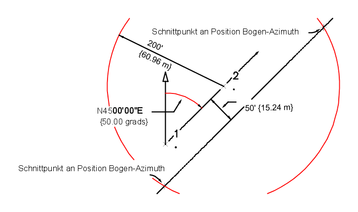 Schnittpunkte befinden sich zwischen dem Bogenradius 200 bei einem Mittelpunkt an Punkt 2 und einem Azimut von 50.0000, der von Punkt 1 mit einem Versatzabstand von 50 nach rechts gezeichnet wurde.