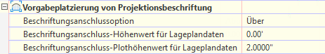 Mit der Option Beschriftungsanschluss-Plothöhenwert für Lageplandaten steuern Sie die Höhe der Führungslinie, wenn die Option Bemaßung für den Anfangs- oder End-Anschlusspunkt im Beschriftungsstil für die Projektion oder den Querschnitt verwendet wird. Dieser Wert wird in Papierbereichseinheiten angegeben.