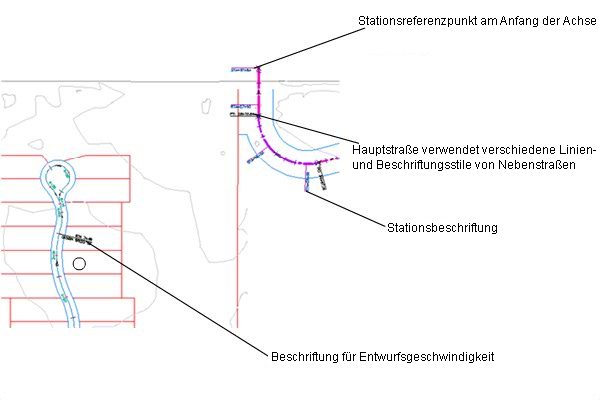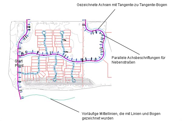 Achsobjekte können Mittellinien von Straßen, Kanalnetze und andere Konstruktionsbasislinien sein. Das Erstellen und Definieren der Achse stellt einen der ersten Schritte beim Entwerfen von Straßen, Gleisen oder Gebieten dar. Sie können die Achsgeometrie als Polylinie zeichnen und dann die benannte Achse aus der Geometrie erstellen. Um bessere Steuerungsmöglichkeiten zu erhalten, können Sie ein Achsobjekt mit den Achswerkzeugen erstellen. Sie können Achsen außerdem mithilfe von Griffen oder mit den Befehlen im Werkzeugkasten Achslayout-Werkzeuge bearbeiten, wobei die Berührungspunkte zwischen den Achskomponenten automatisch beibehalten werden.